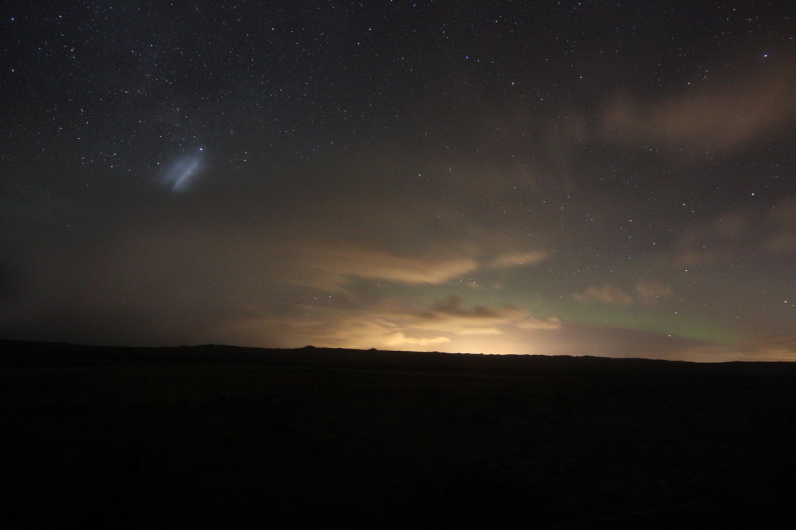 Myndirnar tóku þeir Rúnar Jóhannsson og Þröstur Freyr frá Reykjanesskaga í gærkvöld, skömmu fyrir miðnætti. Horft var í norðurátt og sést eldsneytisskýið við væng stjörnumerkisins Svansins. Græni bjarminn í bakgrunni eru norðurljós en rauðguli bjarminn í forgrunni er ljósmengun frá Reykjanesbæ.