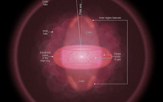 Hringþokan er eins og bjagaður kleinuhringur að lögun. Við horfum hér um bil beint ofan á annan pól þokunnar með bjartleitan efnistanga sem teygir sig frá okkur. Þótt miðja kleinuhringsins virðist tóm, er hún stútfull af efni með lágan efnisþéttleika sem teygir sig að okkur og frá okkur og má líkja við ruðningsbolta sem troðið hefur verið í gat kleinuhringsins.