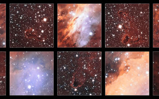 Þessi myndbrot sýna mismunandi hluta af glóandi gasskýinu sem mynda stjörnumyndunarsvæðiðið Rækjuþokuna. Myndin var tekin með VLT Survey Telescope í Paranal stjörnustöð ESO í Chile og er að öllum líkindum sú skýrasta sem tekin hefur verið af þokunni. Mynd: ESO. Þakkir: Martin Pugh