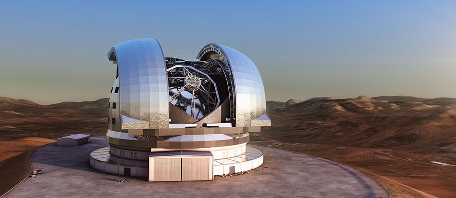 Teikning listamanns af European Extremely Large Telescope (E-ELT) á Cerro Armazones, 3.060 metra háum fjallstindi í Atacamaeyðimörkinni í Chile. E-ELT verður 39,3 metrar í þvermál og því stærsti stjörnusjónauki heims fyrir sýnilegt og innrautt ljós — stærsta auga jarðar. E-ELT verður tekinn í norkun snemma næsta áratug og mun hann leita svara við mörgum af stærstu spurningum okkar tíma. Mynd: ESO/L. Calçada