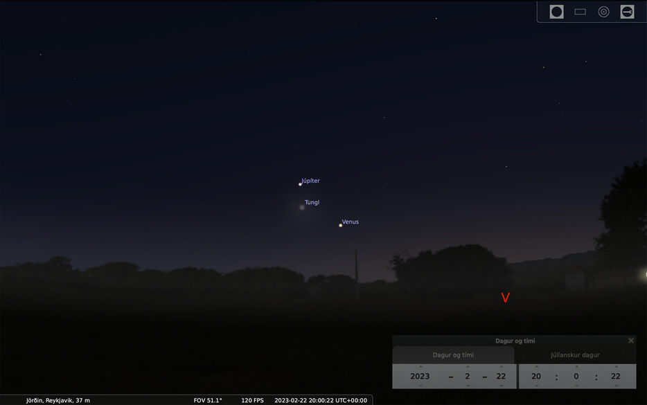 Þann 22. febrúar verður sérstaklega falleg samstaða tunglsins, Júpíters og Venusar. Vonandi sést í heiðan himinn þá.