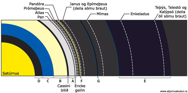 | Uppbygging hringakerfisins. Myndin sýnir staðsetningar helstu hringa Satúrnusar og nokkurra tungla innan þeirara. Aðeins A, B og C hringarnir eru sýnilegir frá jörðu. Hinir hringarnir eru mjög daufir og var ekki vitað um tilvist þeirra fyrr en geimför heimsóttu reikistjörnuna. Mynd: W.H.Freeman og Stjörnufræðivefurinn |